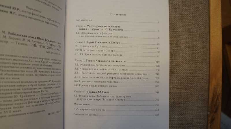 С развернутым автографом автора. Юрий Крижанич (1617 — 1683) - католический священник, приехавший из Хорватии служить в Россию, более трех веков назад `за инакомыслие` был сослан в Тобольск, где в течение 15 лет жил и писал свои известные труды о государственном устройстве, о единении славянских народов, о сохранении культурных традиций и языка. Один из авторов новой книги доктор социологических наук Евгений Акулич, представляя солидный научный труд, отметил, что европейский ученый, философ, политик, публицист Юрий Крижанич – `это фигура мирового значения`, которую в России пока еще мало знают. Его соавтор Мария Акулич подчеркнула, что данное издание - это `открытие Крижанича для широкого круга ученых и для общественности, потому что он предлагал реформы: политическую и экономическую, выступал за верховенство права`. Тираж 500 экз.
