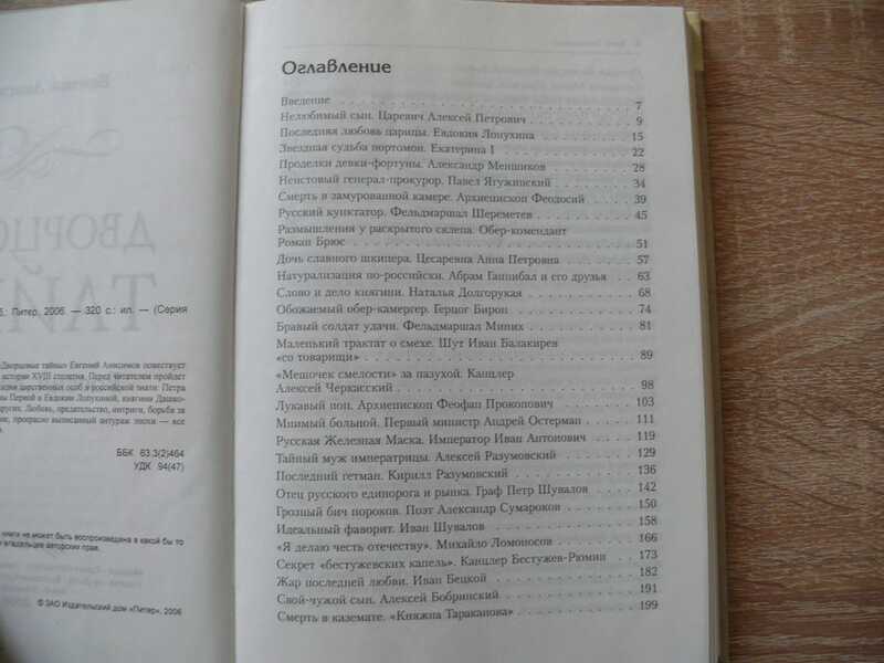 Автор и ведущий телепередачи `Дворцовые тайны` Евгений Анисимов повествует о самых загадочных тайнах российской истории XVIII столетия. Перед читателем пройдет череда увлекательнейших сюжетов из жизни царственных особ и российской знати: Петра Великого и царевича Алексея, Екатерины Первой и Евдокии Лопухиной, княгини Дашковой и графа Суворова, а также многих других. Любовь, предательство, интриги, борьба за власть и неиссякаемая любовь к Отчизне, прекрасно выписанный антураж эпохи - все это не оставит читателей равнодушными. Тираж: 4000 экз.