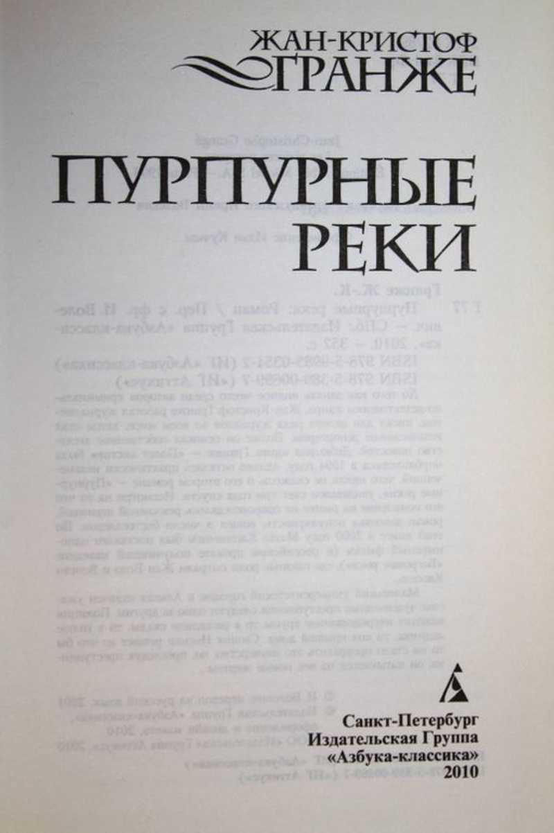 До того как занять видное место среди авторов криминально-детективного жанра, Жан-Кристоф Гранже работал журналистом, писал для целого ряда журналов во всем мире, затем стал независимым репортером. Позже он основал собственное агентство новостей. Дебютная книга Гранже - `Полет аистов` - была опубликована в 1994 году, однако осталась практически незамеченной, чего никак не скажешь о его втором романе - `Пурпурные реки`, увидевшем свет в 1997 году. Несмотря на то, что его появление на рынке не сопровождалось рекламной шумихой, роман добился признания у читателя, вошел в число бестселлеров. По книге в 2000 году Матье Кассовицем был поставлен одноименный фильм (в российском прокате получивший название `Багровые реки`), в котором главные роли сыграли Жан Рено и Венсан Кассель. Маленький университетский городок в Альпах охвачен ужасом: чудовищные преступления следуют одно за одним. Полиция находит изуродованные трупы то в расселине скалы, то в толще ледника, то под крышей дома. Сыщик Ньеман решает во что бы то ни стало прекратить это изуверство, но, преследуя преступника, он обнаруживает все новые жертвы...