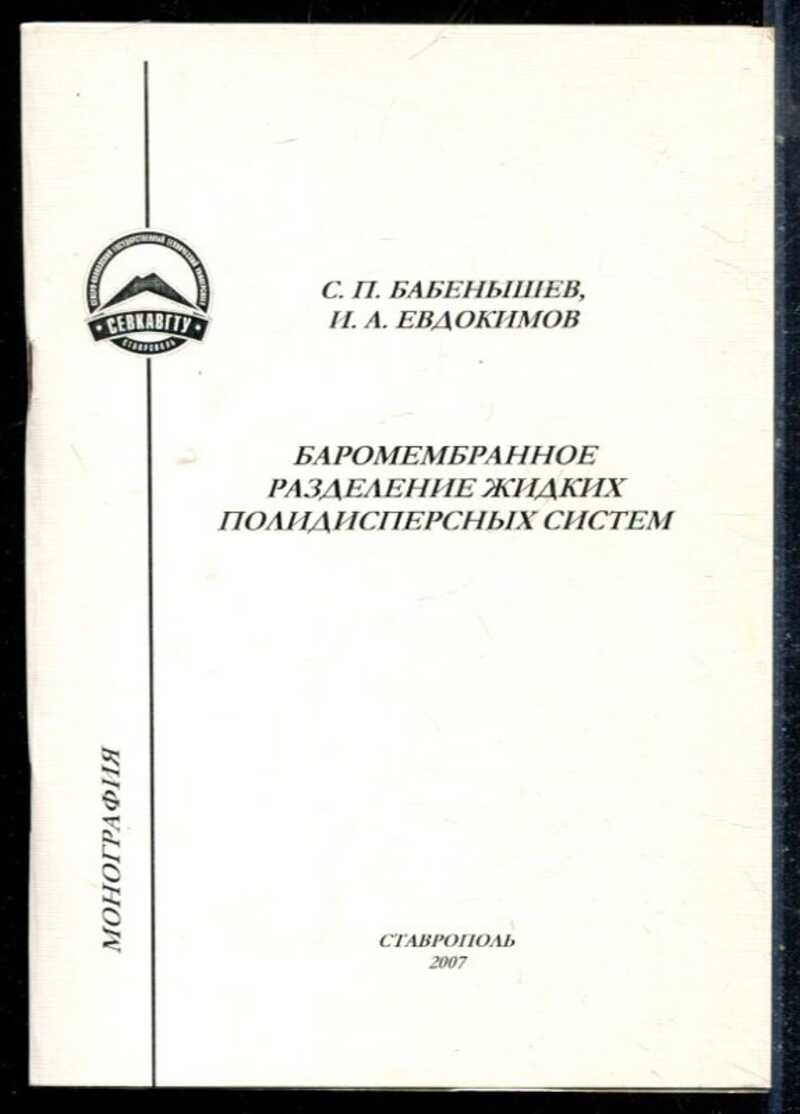 Монография С. П. Бабёнышева и И. А. Евдокимова «Баромембранное разделение жидких полидисперсных систем» посвящена технологиям мембранного разделения в обработке жидких сред. В работе рассмотрены физико?химические основы баромембранных процессов, их аппаратурное оформление и области применения. Особое внимание уделено особенностям разделения высокомолекулярных и полидисперсных систем, в том числе белковых растворов. Приведены методики расчётов, анализ эффективности процессов и перспективы развития технологии. Издание адресовано специалистам в области химической и пищевой промышленности, а также исследователям, занимающимся мембранными технологиями.