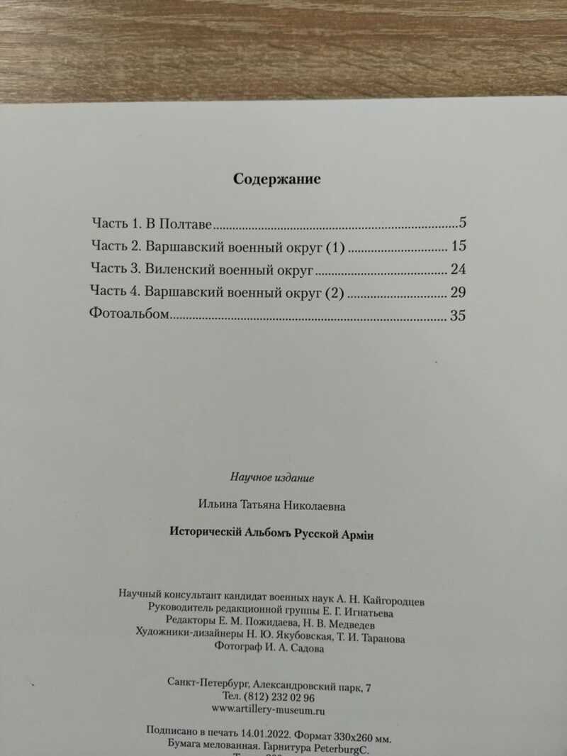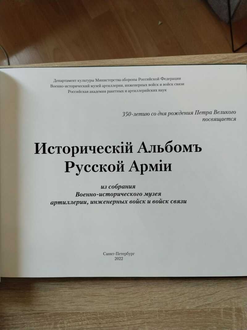 «Историческiй Альбомъ Русской Армiи» – уникальный памятник военной истории России. Он содержит фотографии, которые и сегодня, спустя более 100 лет после со[1]здания, вызывают интерес к запечатлённым на них событиям и людям, жаркие споры относительно истории и технологии создания, чувство глубокого уважения 227 и признательности к труду и мастерству военных историков и фотографов 1909–1913 гг. Подлинные фотографии не могут долго находиться на свету, они угасают. Поэтому в целях обеспечения сохранности альбом экспонируется на выставках редко и непродолжительное время. Данная книга позволяет познакомиться с этим удивительным сокровищем музейного фонда. В данном издании подробнейшее описание всех 24 фотографий и сами фотографии. Тираж 300 экз.