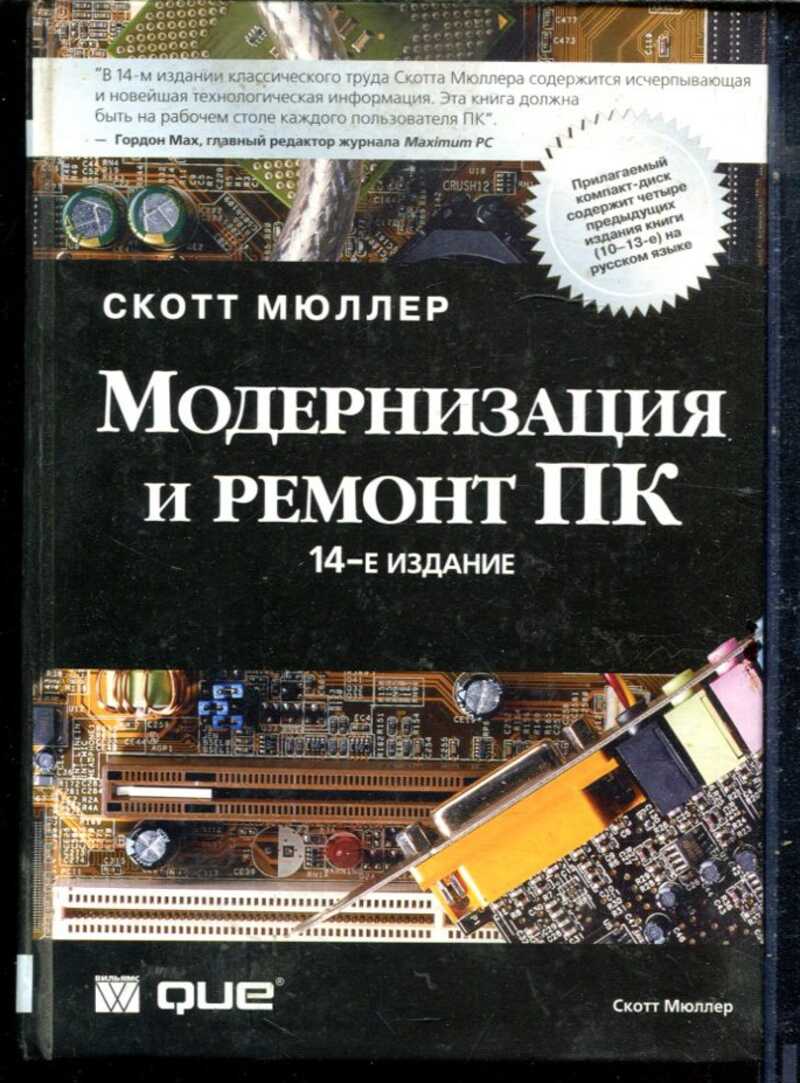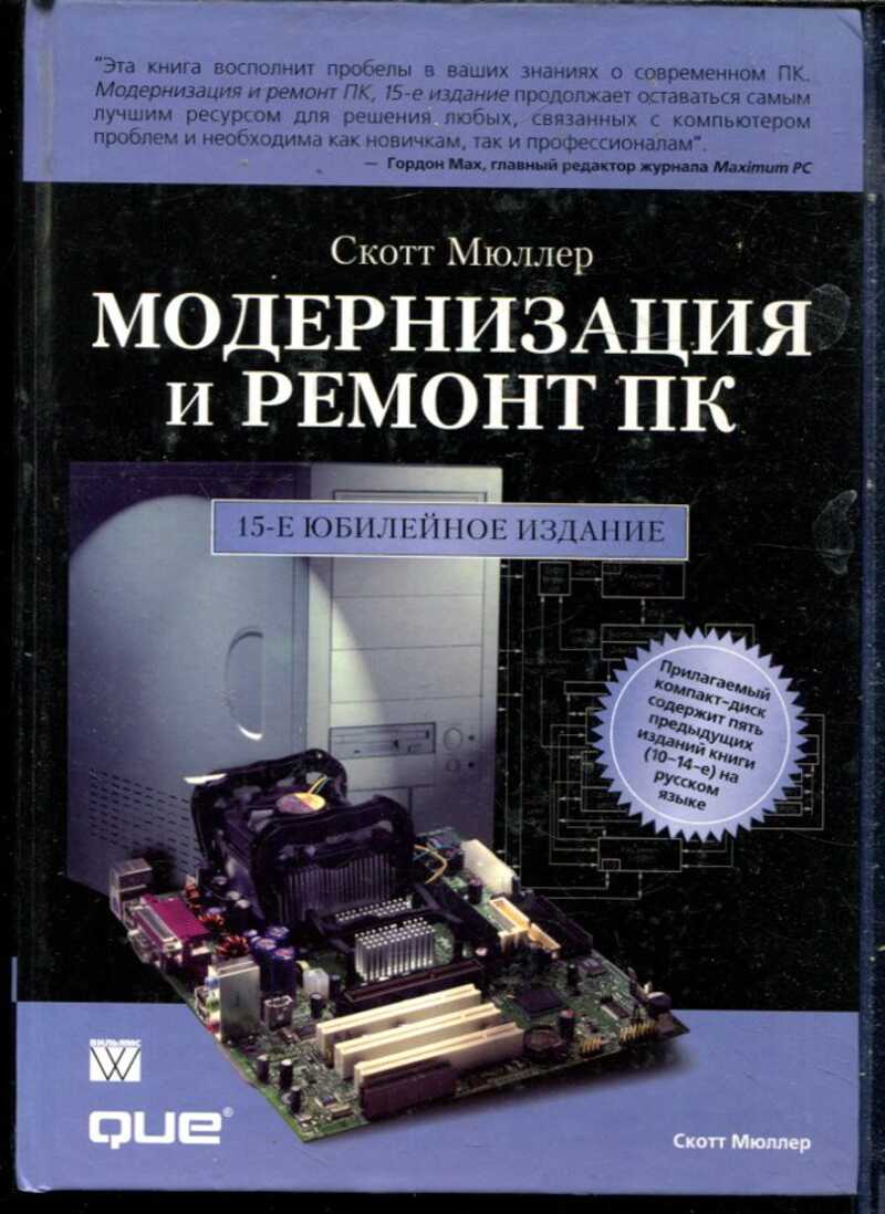 Есть диск. В книге С. Мюллера «Модернизация и ремонт ПК» представлено исчерпывающее руководство по устройству, обслуживанию и усовершенствованию персональных компьютеров. Автор детально разбирает все ключевые компоненты — от процессоров и системных плат до устройств хранения данных, видеоадаптеров и блоков питания, — объясняя их взаимодействие и принципы работы. Читатель найдёт практические рекомендации по установке нового оборудования, сборке компьютера «с нуля», выявлению и устранению неисправностей, настройке производительности, а также информацию о современных технологиях — например, о беспроводных сетях и двухъядерных процессорах. Книга сочетает теоретическую базу с прикладными советами, что делает её ценным ресурсом как для начинающих энтузиастов, так и для опытных пользователей, желающих углубить знания в области аппаратного обеспечения ПК.