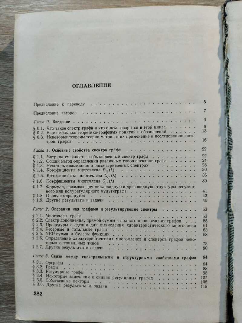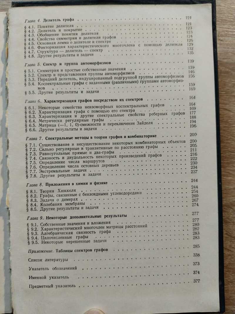 Тираж 1 250 экз. Оглавление: Введение. 1. Основные свойства спектра графа. 2. Операции над графами и результирующие спектры. 3. Связи между спектральными и структурными свойствами графов. 4. Делитель графа. 5. Спектр и группа автоморфизмов. 6. Характеризация графов посредством их спектров. 7. Спектральные методы в теории графов и комбинаторике. 8. Приложения в химии и физике. 9. Некоторые дополнительные результаты. Приложение: Таблицы спектров графов.