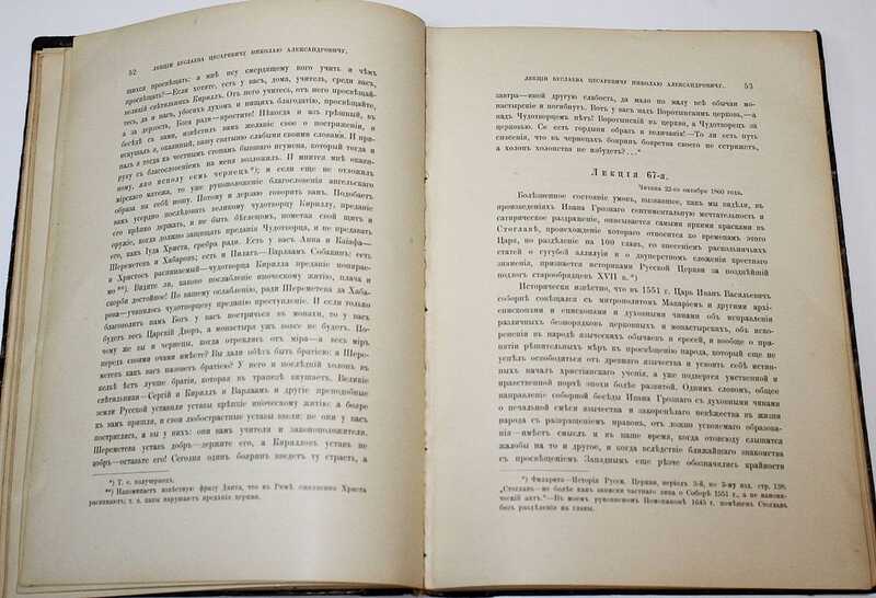 Фёдор Иванович Буслаев (1818 - 1897) - российский лингвист, фольклорист, историк литературы и искусства, глава русской мифологической школы. С 1859 по 1861 год преподавал русский язык и литературу детям царской семьи в Санкт-Петербурге. Вскоре после смерти Буслаева его учениками и последователями был предпринят ряд изданий сочинений учителя. Тогда-то, сначала в журнале `Старина и новизна`, а потом и в отдельной книге впервые увидели свет замечательные `Лекции, читанные... Наследнику Цесаревичу Николаю Александровичу`. Редкость!