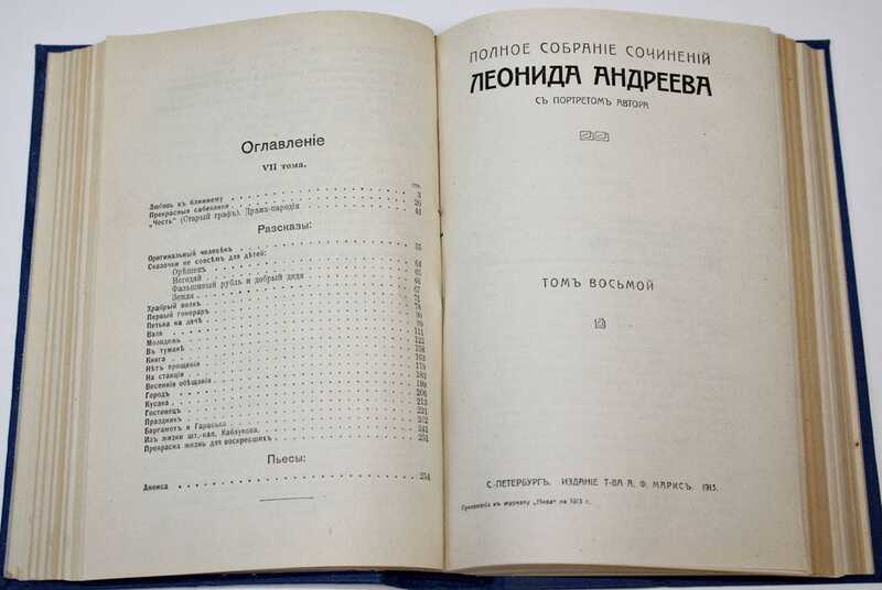 Леонид Николаевич Андреев (1871 - 1919) - русский писатель времён Серебряного века, признанный пионер литературного экспрессионизма. В 1913 г. Л.Андреев заключил договор с `Товариществом А.Ф. Маркс`, согласно которому оно получало право в течение одного 1913 г. выпустить `Полное собрание сочинений`, которое охватывало бы все его произведения, написанные и опубликованные по 1913 г. включительно. Это собрание отличалось от предыдущего (выпущенного издательством `Просвещение` в 13 томах) добавлением романа `Сашка Жегулев` и рассказа `Правила добра`. После издания Маркса при жизни Андреева его `полных` собраний сочинений уже не выходило.