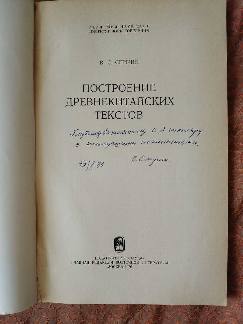Автограф автора на книге Построение древнекитайских текстов