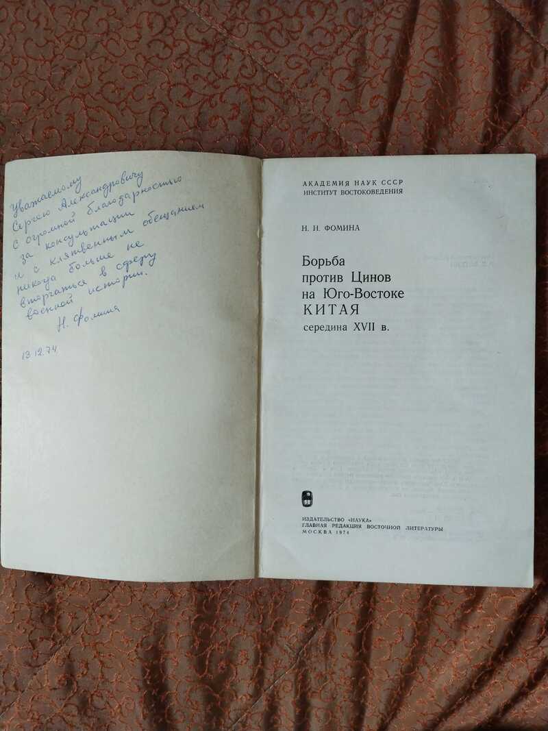 Автограф автора на книге Борьба против Цинов на Юго-Востоке Китая середина XVII в