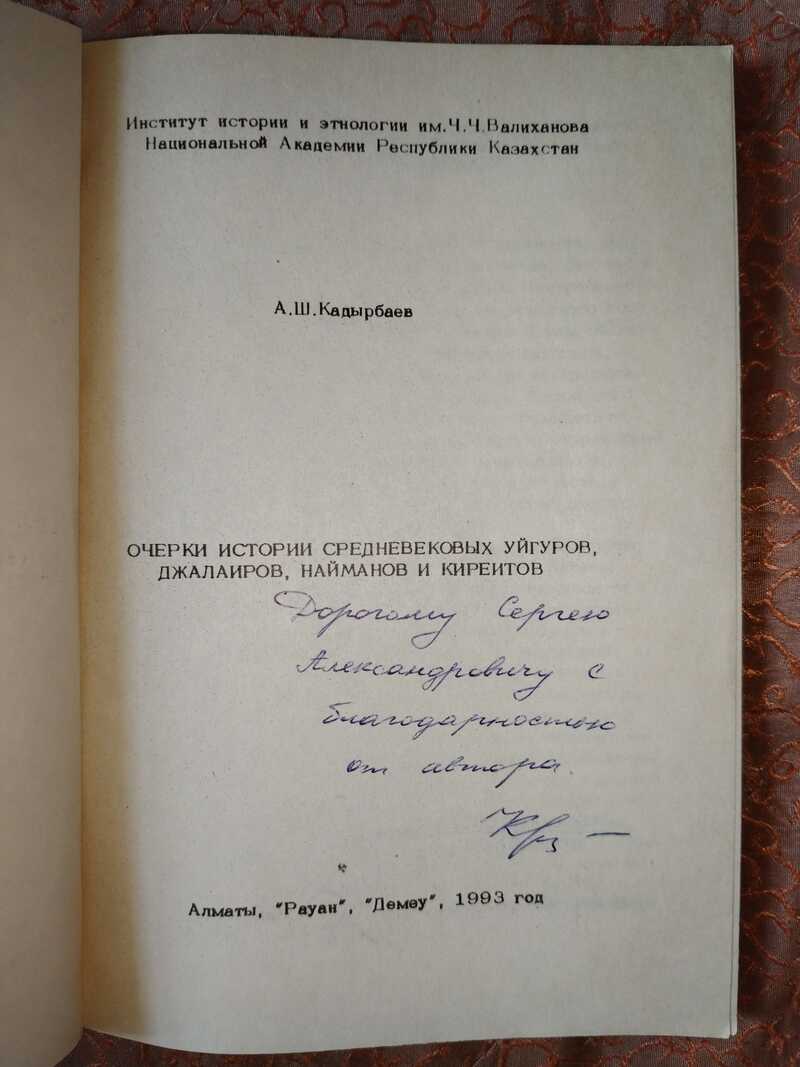 Автограф на книге Очерки истории средневековых уйгуров, джалаиров, найманов и киреитов