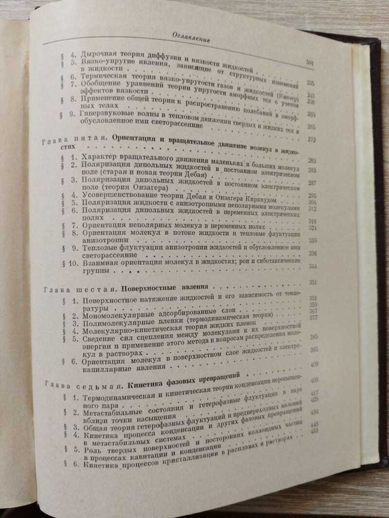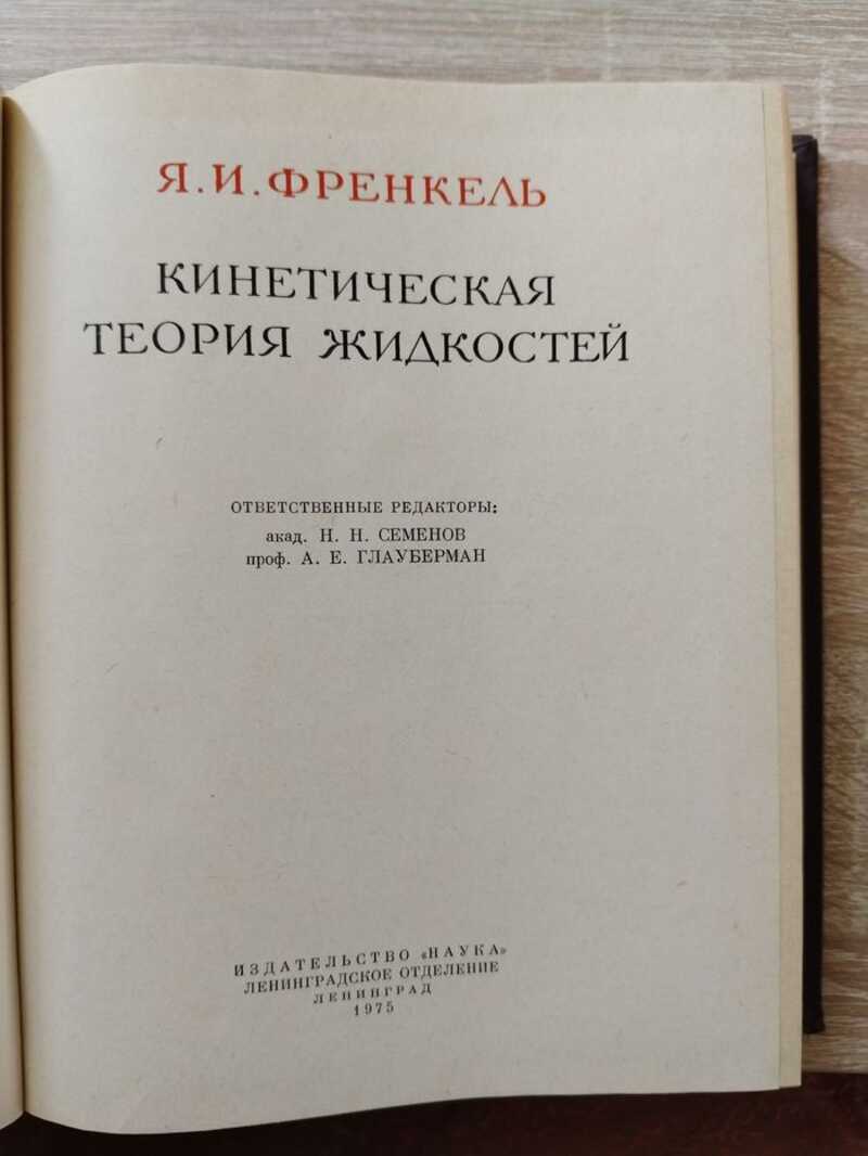 Рассмотрение кинетической теории жидкостей проводится в книге на развитой Я.И. Френкелем (1984-1952) принципиально новой основе сближения их с твердыми телами - в большей степени, чем с газами (вопреки веками сложившейся традиции). Анализируются элементы `твердости` в жидком состоянии и элементы жидкого состояния, которые всегда, а в особенности вблизи температуры плавления, присутствуют в твердом теле. Развито представление о реальном кристалле, даны теория плавления твердых тел и теория теплового движения в конденсированных средах. Рассмотрены эффект ориентационного плавления и вращательное движение молекул жидкости. Специальное внимание уделено поверхностным явлениям, росту кристаллов, фазовому переходу жидкость-твердое тело, явлению гетерофазных флуктуаций. Отдельная глава посвящена теории высокомолекулярных соединений. В приложении к книге приведены научно-биографический очерк о Я.И. Френкеле И.Е Тамма и другие материалы. Библиография - 358 названий, рисунков - 58, таблиц - 11. Тираж 5000 экз.