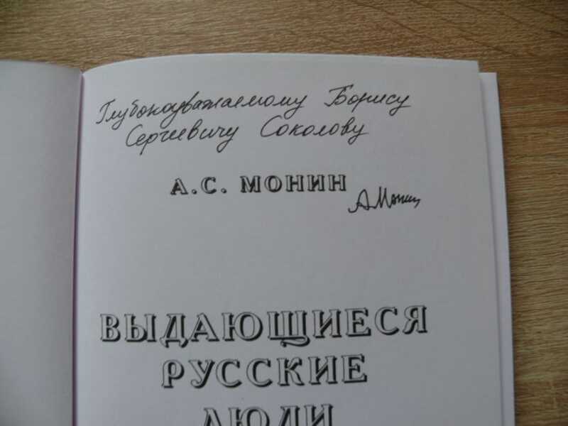 С дарственной надписью и автографом автора Борису Сергеевичу Соколову — советскому и российскому учёному-геологу и палеонтологу, академику АН СССР (1968) на титуле. Содержание: Введение. - Глава 1. О загадочной русской душе (Физика и психика. Общение душ. Цели - биологические и духовные. Национальность душ. Русская духовность. Православие. Русская жертвенность. Красота и ширь и удаль. Американское потребительство. Русская идея). - Глава 2. Об интеллигенции (Сознание определяет бытие. Современная модель фашизма. О будущем обществе. Бюрократия. Положение интеллигенции в прошлом и настоящем. Интеллигенция как класс. О гениях. Берегитесь агитпропа. Ни диктаторы, ни демократии). - 3 глава. Выдающиеся русские люди (Правила отбора. Священники, философы и историки. Естествоиспытатели, путешественники и врачи. Агрономы и инженеры. Писатели и поэты. Художники, скульпторы и архитекторы. Композиторы, артисты и кинорежиссеры. Военные и общественные деятели. Список ста). Тираж 500 экз. Автограф: `Глубокоуважаему Сергею Сергеевичу Лаппо А Монин`. Андрей Сергеевич Монин (2 июля 1921 года, Москва — 22 сентября 2007 года, там же) — советский и российский геофизик, океанолог, математик, специалист в области гидродинамики, академик РАН (2000, член-корр. АН СССР с 1972), директор Института океанологии АН СССР (1965—1987).