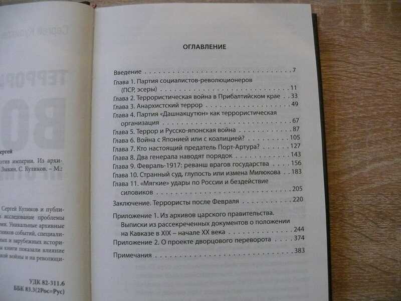 Кандидат исторических наук Сергей Викторович Куликов и публицист Дионис Леонидович Каптарь, пишущий под псевдонимом Дмитрий Зыкин, провели исследование проблемы терроризма в Российской империи. Уникальные архивные документы, воспоминания участников событий, специализированные работы отечественных и зарубежных историков - основа, на которой авторы книги показали влияние терроризма на ход русско-японской войны и на революционные события начала XX века. Почти половину объема книги составляет публикация архивных документов. Из оглавления: Партия социалистов-революционеров (ПСР, эсеры). – Террористическая война в Прибалтийском крае. – Анархистский террор. – Партия «Дашнакцутюн» как террористическая организация. – Террор и Русско-японская война. – Война с Японией или с коалицией? – Кто настоящий предатель Порт-Артура? – Глава 8. Два генерала наводят порядок. – Февраль-1917: реванш врагов государства. – Странный суд, глупость или измена Милюкова. – «Мягкие» удары по России и бездействие силовиков. – Террористы после Февраля. – Приложения: Из архивов царского правительства. Выписки из рассекреченных документов о положении на Кавказе в XIX – начале XX века (Представление МВД…»О проекте положения об управлении делами Армяно-грегорианской церкви. 31.12.1835 г. – Записка министра иностранных дел А.М. Горчакова министру внутренних дел П.А. Валуеву «По поводу переписки по армянским делам…». 1.09.1865 г. – «Записка по разным вопрсам, касающимся армяно-грегорианского духовенства». Составлена в Управлении главноначальствующего по гражданской части на Кавказе. 1883 г. – Журнал Совещания по армянским делам 12.02.1891 г. – Доклады начальника Канцелярии наместника Н,Л. Петерсена – кавказскому наместнику графу И.И. Воронцову-Дашкову. 18.07.1905 г. – Кавказский наместник граф И.И. Воронцов-Дашков – председателю Совета министров и министру внутренних дел П.А. Столыпину. 8 и 22.08. 13.09.1906 г., 25.01.1907 г., 24.05., 12.06.1908 г. – Программа-минимум Дашнакцутюн. 1907 г. – Записка прокурора Эчмиадзинского Синода Л.А. Френкеля. 1907 г. – Представление МЫД – кавказскому наместнику графу И.И. Воронцову-Дашкову. 16.12.1907 г. – Представление МВД… в Совет министров.17.08.1908 г. – Записка Департамента полиции МВД «Обзор кавказских революционных партий». 1.09.1909 г. – Резолюция 5-го съезда общего собрания Дашнакцутюн в Варне. 1909 г. – Записка и рапорт чиновника особых поручений Департамента духовных дел иностранных исповеданий МВД А.В. Петрова – председателю Совета министров и министру внутренних дел П.А. Столыпину. 1911 г. – Секретное письмо и донесение посла России в Турции Н.В. Чарыкова. 1911 г. – Отчет о заседании Совета Дашнакцутюн в Берлине. 1914 г.). – О проекте дворцового переворота.