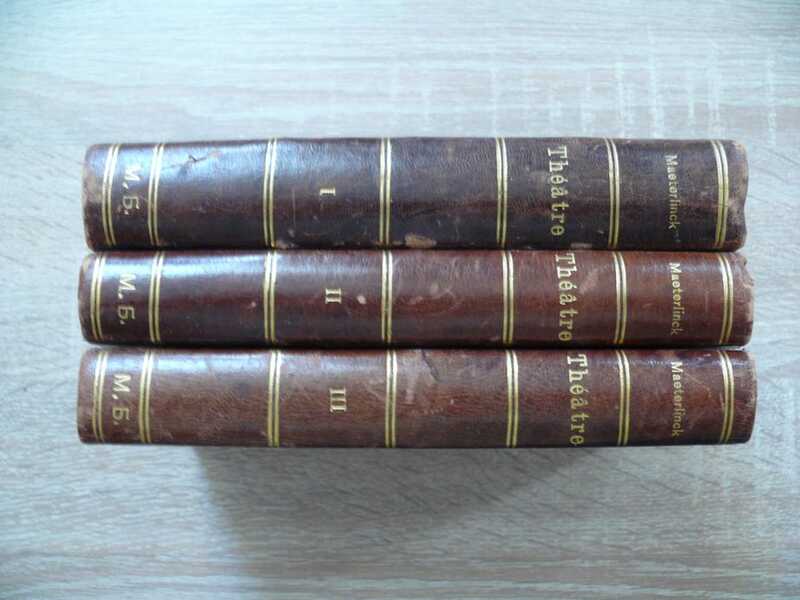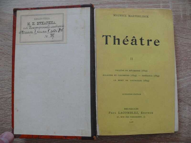 Прижизненное издание. Владельческий переплет с инициалами и экслибрис М. Н. Бухарина на втором томе - Бухарин Михаил Николаевич - писатель, сын одесского градоначальника. Был судебным следователем в Бессарабской губернии, товарищем прокурора одесского окружного суда. В 1892 г. перешел в ведомство путей сообщения, был главным инспектором шоссейных и водяных сообщений и членом совета министра путей сообщения. В 1888 г. появился его водевиль "Что ценят женщины"; затем одноактная комедия "В такую ночь" и, наконец, историческая пьеса в 4 действиях "Измаил", имевшая в 1902 г. крупный успех в театре Литературно-Художественного общества. Морис Метерлинк 1889 – выходит первая пьеса-сказка "Принцесса Мален" (La Princesse Maleine), созданная по мотивам сказки братьев Гримм "Девушка Мален". Однако сказочные мотивы подвергаются значительной переработке: тайна, неведомое, злое, молчание, скрывающее непознаваемые тайны души и мира, становятся основным содержанием произведения. Драма, как и первый сборник стихов, не находят читателя и не раскупаются. 1891 – в Париже в театре "Искусство" состоится премьера пьесы "Непрошенная" (L'Intruse, 1890). Эта и несколько последующих пьес ("Слепые", "Там внутри" и "Смерть Тентажиля") сам автор относит к театру марионеток. Метерлинк считает, что человека на сцене вернее всего представит марионетка, ибо любой актер внесет в свою игру много личного, его же герои представляют человека вообще. "Непрошенная" воспроизводит ожидание рядом с комнатой роженицы. Все ждут известий от врача, и лишь слепой старик чувствует приближение Смерти. 1890 – пьеса "Слепые" (Les Aveugles). Одноактная драма воспроизводит ожидание слепых своего поводыря и их размышления о том, что они воспринимают, ужас от ощущения своей беспомощности и невозможности распознать происходящее в мире. Содержание 2-го тома: *Пелиас и Мелисанда* (1892). *Алладина и Паломид (1894). Там внутри* (1894). *Смерть Тентажиля* (1894) Морис Полидор Мари Бернар Метерлинк (фр. Maurice (Mooris) Polydore Marie Bernard Maeterlinck; 1862-1949) - бельгийский писатель, драматург и философ. Писал на французском языке. Лауреат Нобелевской премии по литературе за 1911 год.