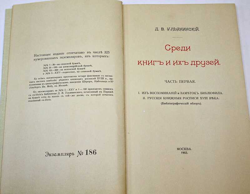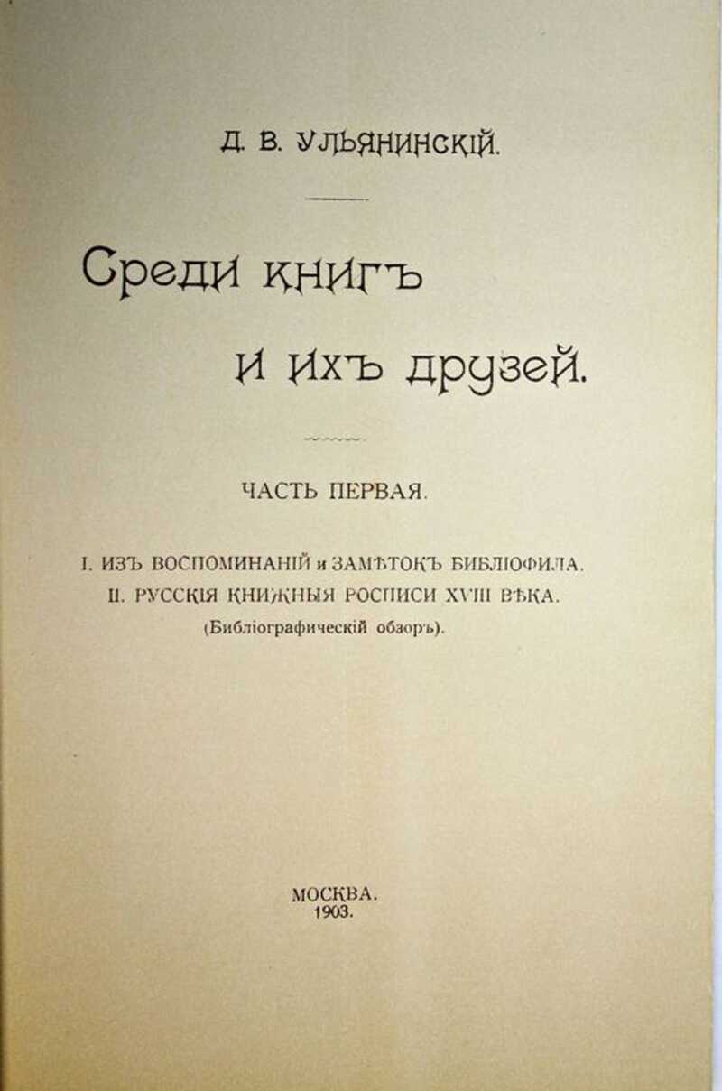 Факсимильное издание известной книги знаменитого русского библиофила, вышедшей в 1903 году. От издательства: Выпуском этой книги издательство открывает серию «Библиофильские редкости». Книга Д.В. Ульянинского как своеобразная автобиография собирателя и как интереснейшее явление русской библиофильской литературы сохранила свое значение для наших дней. Едва ли нужно пересказывать содержание издания: каждый, кто неравнодушен к книге, кто по-настоящему любит книгу, кто относится к книге с подлинным уважением, непременно прочтет ее до конца. Она требует неторопливого и внимательного чтения, с раздумьями, и, несомненно, после того, как будет прочитана, вызовет желание еще узнать об авторе и о том, чему она посвящена. Большая радость - испытать чувство приобщения к волнующему миру книжных разысканий и находок, профессионального изучения книги как одного из самых совершенных явлений культуры человечества. Имя автора «Среди книг и их друзей» нельзя назвать популярным или широко известным, но оно с уважением и оттенком особенного почтительного отношения произносится в кругах знатоков книги. Конечно, деятельность Д.В. Ульянинского как библиофила и библиографа отмечена чертами, присущими своему времени: известной ограниченностью интересов, своеобразным и порою подчеркнутым культом книжных редкостей. Но заслуживает высокого уважения вдохновенное и подвижническое служение книге, которое сочеталось у Д.В. Ульянинского с глубокими знаниями в области книговедения, особенно истории книги и библиографии как «синтеза книжной мысли». Д.В. Ульянинский, как и другие крупные библиографы, деятели Русского библиографического общества, отчетливо понимал, что повышение уровня книжной культуры невозможно без приобщения к библиографии. Не случайно на эмблеме Русского библиографического общества, украшавшей обложку журнала «Библиографические известия»,- слова, донесшие свой мудрый смысл и не утратившие глубокого значения до наших дней: «Библиография есть ключ всех наук».