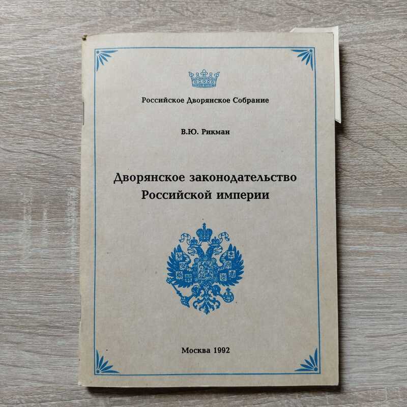 Предлагаемый вниманию читателя труд Товарища Главного герольдмейстера Дворянского Собрания В.Ю. Рикмана является первым изданием Российского Дворянского Собрания, посвященным отмечаемому в 1993 году международному году памяти Государя Императора Николая II. Данная работа подробно анализирует дворянское законодательство от времени его возникновения до 1917 года, а также рассматривает опыт его применения в наши дни в деятельности Российского Дворянского Собрания. По-видимому, впервые в истории отечественной литературы подобного рода появилось издание, столь полно и последовательно характеризующее изменение дворянского законодательства в России. Данная книга будет представлять несомненный интерес для специалистов и широкого круга читателей, интересующихся историей дворянского сословия в России и вопросами его возрождения в наше столь непростое время. Очерк истории дворянского законодательства Российской Империи: рассматриваются свойства (древнее, выслуженное, титулованное) и `виды` дворянского состояния (потомственное, личное), приобретение (по ордену, чину, пожалованию царем), сообщение, лишение и восстановление дворянства, доказательства и акты дворянского состояния, получение и утверждение титулов, и их передача. Публикуется `Положение о порядке приема в Дворянское собрание` с последующими его изменениями, как опыт современного применения дворянского законодательства и образец родословной справки (анкеты) о вступающем в Дворянское собрание.