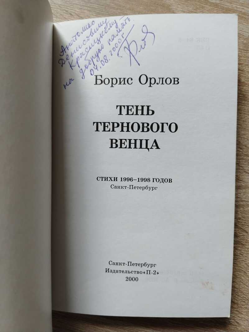 Развернутый автограф автора. Борис Александрович Орлов - русский поэт. Окончил Ленинградское высшее военно-морское инженерное училище имени Ф.Э. Дзержинского (1977), Московский литературный институт имени М. Горького (1985). Служил на Северном флоте на атомной подводной лодке (1977—83). Работал в газетах: "На страже Заполярья" (1983—86), "Советский моряк" (1986—90). Был начальником отдела Центрального военно-морского музея (1990—93). Руководит ЛИТО "Путь на моря" им. Всеволода Азарова. Капитан 1-го ранга. Автор 13 книг стихов. Главный редактор газеты "Литературный Петербург" , член Санкт-Петербургского союза журналистов, Православного общества санкт-петербургских писателей. Академик Петровской академии наук и искусств. Награжден медалями. Секретарь Союза писателей России, председатель правления Санкт-Петербургского отделения Союза писателей России. Живёт в Кронштадте.