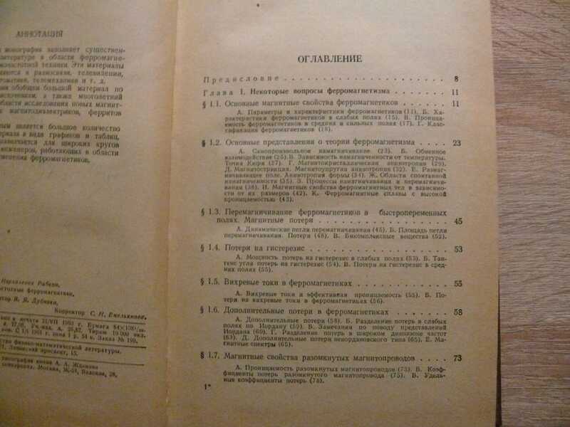 Настоящая монография заполняет существенный пробел в литературе в области ферромагнетиков для высокочастотной техники. Эти материалы широко применяются в радиосвязи, телевидении, электронной автоматике, телемеханике и т.д.. В монографии обобщен большой материал по литературным источникам, а также многолетний опыт автора в области исследования новых магнитных материалов: магнитодиэлектриков, ферритов и т.п. Очень ценным является большое количество справочного материала в виде графиков и таблиц.