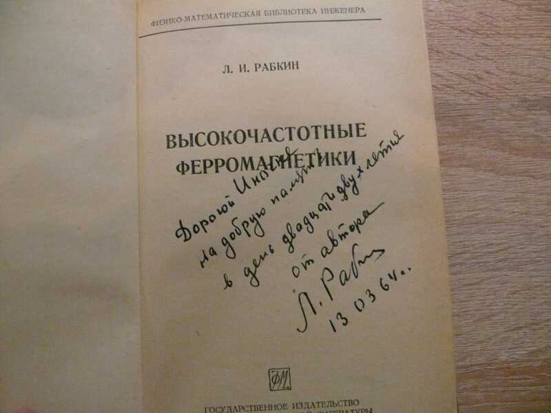 Автограф автора на книге Высокочастотные ферромагнетики