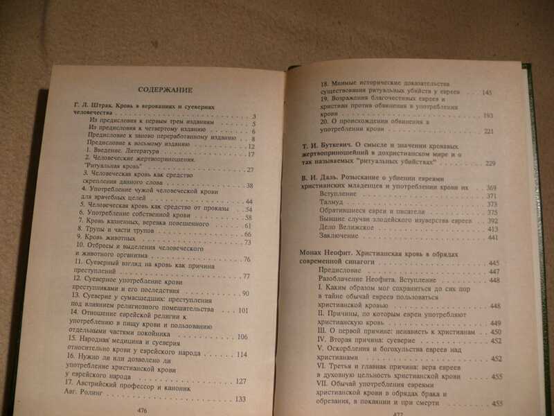 Зеленый переплет Книга представляет современному читателю труднодоступные ныне и уникальные исследования Г.Л.Штрака. В.И.Даля, Монаха Неофита и Т.И.Буткевича, выясняющие религиозно-культурное значение крови. В этих сочинениях, ставших библиографической редкостью, привлекается большой народномедицинский, психологический, криминальный, культовый и вероучительный материал. В центр поставлен затемненный суевериями скандальный вопрос о употреблении крови в еврейских ритуалах. Сборник впервые дает возможность познакомиться объективно с разными точками зрения на этот вопрос. Содержание: Штрак Г.Л. Кровь в верованиях и суевериях человечества. - Буткевича Т.И. О смысле и значении кровавых жертвоприношений в дохристианском мире и о так называемых ритуальных убийствах. - Даль В.И. Розыскание о убиении евреями христианских младенцев и употреблении крови их. - Монах Неофит. Христианская кровь в обрядах современной синагоги.