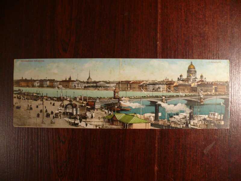 Цветная панорамная карточка Николаевская набережная (ныне Лейтенанта Шмидта). Исаакиевский собор. Река Нева. Благовещенский (ныне Лейтенанта Шмидта) мост, на мосту большое количество людей и экипажей. Адмиралтейство на заднем плане. Часовня на переднем плане. Повозки. Лошади. Люди. Пристань. Паромы. Размер 280 на 95 мм.