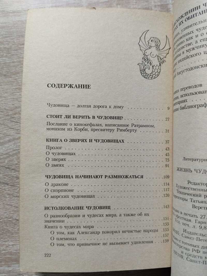 По примеру средневековых кодексов, под обложкой собрались лучшие образцы трактатов о чудовищах, написанных в Средние века: Книга о зверях и чудовищах неизвестного автора VIII века, глубокие исследования о драконах, скорпионах и морских чудищах энциклопедиста XIII века Фомы из Кантимпрэ, географические выкладки Гонория Августодонского (XII в.), поселившего монстров по всему Кругу земному, и весьма актуальное послание монаха Ратрамна (VIII в.), рассматривающее вопрос о том, крестить или не крестить собакоголовых людей.