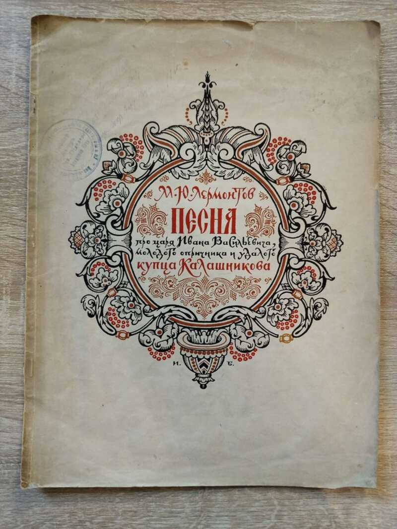 Историческая поэма в народном стиле М.Ю. Лермонтова, написанная в 1837 году и впервые опубликованная в 1838 году в «Литературных прибавлениях к „Русскому инвалиду”. В 1840 году эта поэма открыла единственное прижизненное издание поэта — сборник «Стихотворения М. Лермонтова». Сюжет поэмы разворачивается во времена правления царя Ивана Грозного. Стиль поэмы можно охарактеризовать как русский народный эпос. Она является стилизацией русского народного творчества в большой эпической форме. В основе произведения лежит фольклорный сюжет, восходящий к народным песням о царе Иване Грозном, многие из которых к XIX веку сохранились и были записаны. Эта поэма в контексте всего творчества поэта воспринимается как своеобразный итог работы Лермонтова над русским фольклором. Также стоит отметить уникальность этого произведения. По жанру и художественному своеобразию она оказалась единственной в своем роде и не получила продолжения ни в творчестве ее автора, ни у других поэтов. Одна из последних работ ( 1939) И. Билибина, опубликованная впервые в 1941 году ( уменьшенный формат). Иван Яковлевич Билибин (4 [16] августа 1876, Тарховка, Санкт-Петербургская губерния — 7 февраля 1942 Ленинград) — русский живописец и график, последователь ретроспективизма, важная фигура среди петербургских художников Серебряного века, позднее — эмигрант-возвращенец первой волны, педагог. Член обществ «Мир искусства» (в 1900–1903 и с 1910), один из членов-учредителей «Союза русских художников» (в 1903–1910), преподаватель Института живописи, скульптуры и архитектуры в Ленинграде (с 1936).