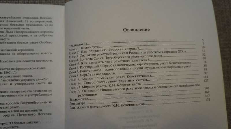 В истории русской науки и техники середины XIX в. Константин Иванович Константинов занимает особое место. И хотя основные его разработки относятся к ракетной технике и артиллерии, тем не менее интересы его были разносторонни и многообразны и простирались от электротехники и механики до воздухоплавания и подводного плавания. Его всегда отличали знание предмета исследования и новаторство при решении сложных технических проблем. Являясь по натуре изобретателем, К.И. Константинов предложил ряд оригинальных технических решений, опередивших современную ему науку на несколько десятилетий. Он изобрел электробаллистический хронограф и с его помощью впервые в мировой практике определил скорость полета снаряда в различных точках траектории, создал электробаллистический маятник для оценки движущей силы пороховых ракет, внес усовершенствования в процесс изготовления ракет, превратив их производство из кустарного в механизированное. Вместе с совершенствованием производства пороховых ракет К.И. Константинов значительно усовершенствовал их конструкцию, заложил научные основы их создания, что в известной мере подняло отечественную технику на более высокую ступень развития по сравнению с зарубежной. Неоспоримы заслуги К. И. Константинова в деле разработки основ боевого применения ракет, а также в создании систем ракет для спасения людей, терпящих кораблекрушение. К.И, Константиновым опубликовано более 100 работ, в том числе пять на французском языке. В его перспективных планах остались работы по дальнейшему развитию ракетного производства, издание научного сборника "Ракетная техника". Он умер в расцвете творческих сил — 52 лет от роду. К сожалению, в современной литературе до сих пор отсутствует всестороннее изложение творческой биографии К.И. Константинова. Она излагалась, как правило, односторонне, будучи ограничена определенным кругом интересов ее авторов . Опубликованные работы не отвечали на ряд вопросов о жизни К.И. Константинова, например о его происхождении или месте захоронения его праха. Творческую биографию К.И. Константинова отчасти можно проследить по его работам или архивным источникам. Его военная карьера от фейерверкера Михайловского артиллерийского училища (1834) до генерал-лейтенанта (1864) прослеживается по его послужным спискам. Однако о его личной жизни, его характере и привычках сохранились лишь весьма скудные сведения, поскольку он оставил слишком мало воспоминаний, а его эпистолярное наследие пока еще не обнаружено. Тираж 230 экз.