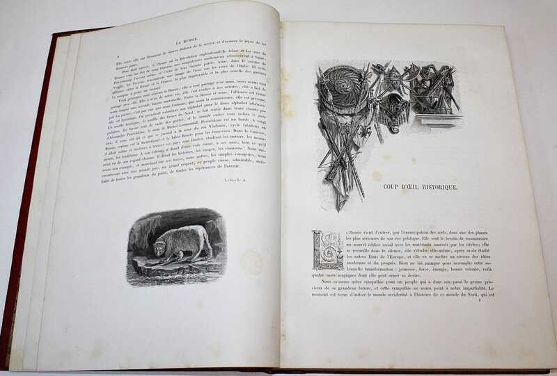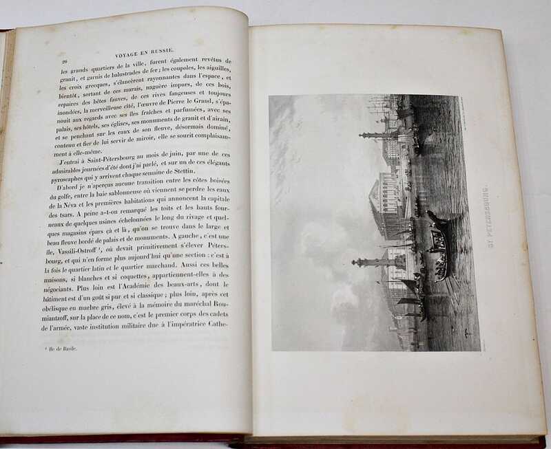 Сен-Жюльен де Шарль (1802–1869) - французский журналист и литератор, служивший в Петербурге секретарем и библиотекарем у графа И.С.Лаваля, издатель петербургской газеты Le Furet, преподаватель французской литературы в Петербургском университете; Рауль Бурдье — французский писатель, переводчик и путешественник /// Издание иллюстрировано 20 гравюрами работы Руарга, Утвэта и Керно на отдельных листах, (некоторые гравюры — с неполной ручной акварельной раскраской). В первой части книги рассказывается о Санкт-Петербурге, Царском Селе, Гатчине, Павловске, Ораниенбауме, парковом ансамбле Петергофа. Отдельные главы посвящены Финляндии и Москве. Вторая часть книги посвящена поездке в Нижний Новгород, третья - на Кавказ, четвертая в Сибирь и на Камчатку.