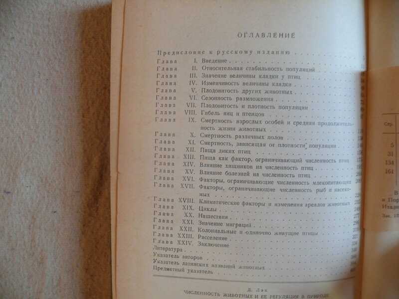 Книга посвящена разбору основных закономерностей динамики численности популяций животных в зависимости от интенсивности размножения, обилия пищи, конкуренции, влияния хищников, болезней, естественной смертности и т.д. Материалы, освещенные в книге, имеют важное значение для эпидемиологии, разработки карантинных мероприятий, для сохранения и реконструкции фауны и для охотничьего промысла. Предназначена для биологов различных специальностей. Содержание: Глава I. Введение. Глава II. Относительная стабильность популяций. Глава III. Значение величины кладки у птиц. Глава IV. Изменчивость величины кладки. Глава V. Плодовитость других животных. Глава VI. Сезонность размножения. Глава VII. Плодовитость и плотность популяции. Глава VIII. Гибель яиц и птенцов. Глава IX. Смертность взрослых особей и средняя продолжительность жизни животных. Глава X. Смертность различных полов. Г лава XI. Смертность, зависящая от плотности популяции. Глава XII. Пища диких птиц. Глава XIII. Пища как фактор, ограничивающий численность птиц. Г лава XIV. Влияние хищников на численность птиц. Г лава XV. Влияние болезней на численность птиц. Глава XVI. Факторы, ограничивающие численность млекопитающих. Глава XVII. Факторы, ограничивающие численность рыб и насекомых. Глава XVIII. Климатические факторы и изменения ареалов животных. Глава XIX. Циклы. Глава XX. Нашествия. Глава XXI. Значение миграций. Глава XXII. Колониальные и одиночно живущие птицы. Глава XXIII. Расселение. Глава XXIV. Заключение. Литература. Указатель авторов. Указатель латинских названий животных. Предметный указатель. Ил. 52. Табл. 41.