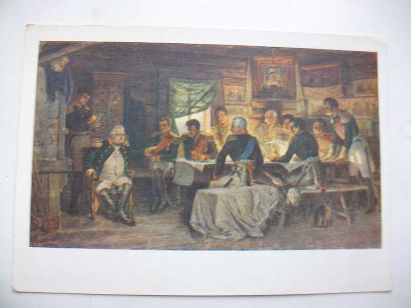 Цветная почтовая карточка с видом на комнату в избе с группой военных под предводительством Кутузова.