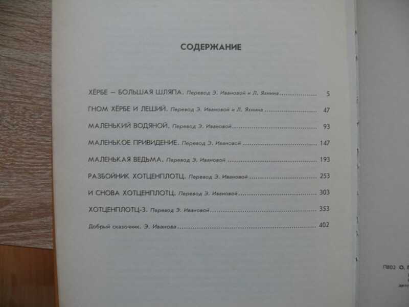 В книгу вошли наиболее известные сказки знаменитого немецкого детского сказочника Отфрида Пройслера. Три сказки о Разбойнике Хотценплотце, две сказки про Гнома Хербе и его друга - Лешего Цвоттеля, а также сказки Маленький Водяной, Маленькое Привидение и Маленькая Ведьма. Хербе - Большая Шляпа (повесть, перевод Э. Ивановой, Л. Яхнина, иллюстрации В. Родионова), cтр. 5-46. Гном Хербе и леший (повесть, перевод Э. Ивановой, Л. Яхнина, иллюстрации В. Родионова), cтр. 47-92. Маленький водяной (повесть, перевод Э. Ивановой, иллюстрации В. Родионова), cтр. 93-146. Маленькое привидение (повесть, перевод Э. Ивановой, иллюстрации В. Родионова), cтр. 147-192. Маленькая ведьма (повесть, перевод Э. Ивановой, иллюстрации В. Родионова), cтр. 193-252 Разбойник Хотценплотц (повесть, перевод Э. Ивановой, иллюстрации В. Родионова), cтр. 253-302 И снова Хотценплотц (повесть, перевод Э. Ивановой, иллюстрации В. Родионова), cтр. 303-352 Хотценплотц-3 (повесть, перевод Э. Ивановой, иллюстрации В. Родионова), cтр. 353-401 Эльвира Иванова. Добрый сказочник (послесловие), cтр. 402-413