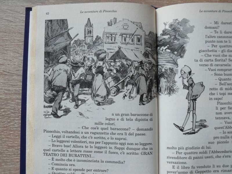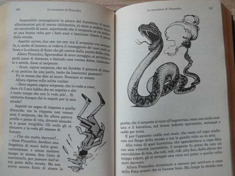 Questa, come si sa, non e una storia di re. E una storia di fate turchine e di balene, ma anche di chioccioline, di cani da guardia, di bugie e di dispetti. E poi, ancora, di grilli parlanti che sanno tutto e che non stanno mai zitti, di vecchi babbi che girano il mondo alla ricerca dei propri figli e di una sfilza di imbroglioni e tipacci loschi. Una storia di soldi, di amicizia, di speranze e di sconfitte: insomma, una storia di avventure e idee geniali. Ma, soprattutto, e la storia di un pezzo di legno, non proprio sincero ma di buon cuore, che di bugia in bugia, di ruzzolone in ruzzolone impara a... vivere. Questa storia nacque un po` per divertimento e un po` per la necessita di Collodi di guadagnare qualche soldo in piu, scrivendone il primo capitolo sul Giornale dei Bambini nel 1880. La vicenda completa fu pubblicata piu tardi ed ebbe un immediato successo: il simpatico personaggio, protagonista di una serie mozzafiato di avventure e monellerie, divenne immediatamente la figura piu popolare della letteratura per l`infanzia in Italia. Questa edizione offre le illustrazioni dell`epoca di Attilio Mussino, che hanno reso Pinocchio la favola illustrata famosa in tutto il mondo.