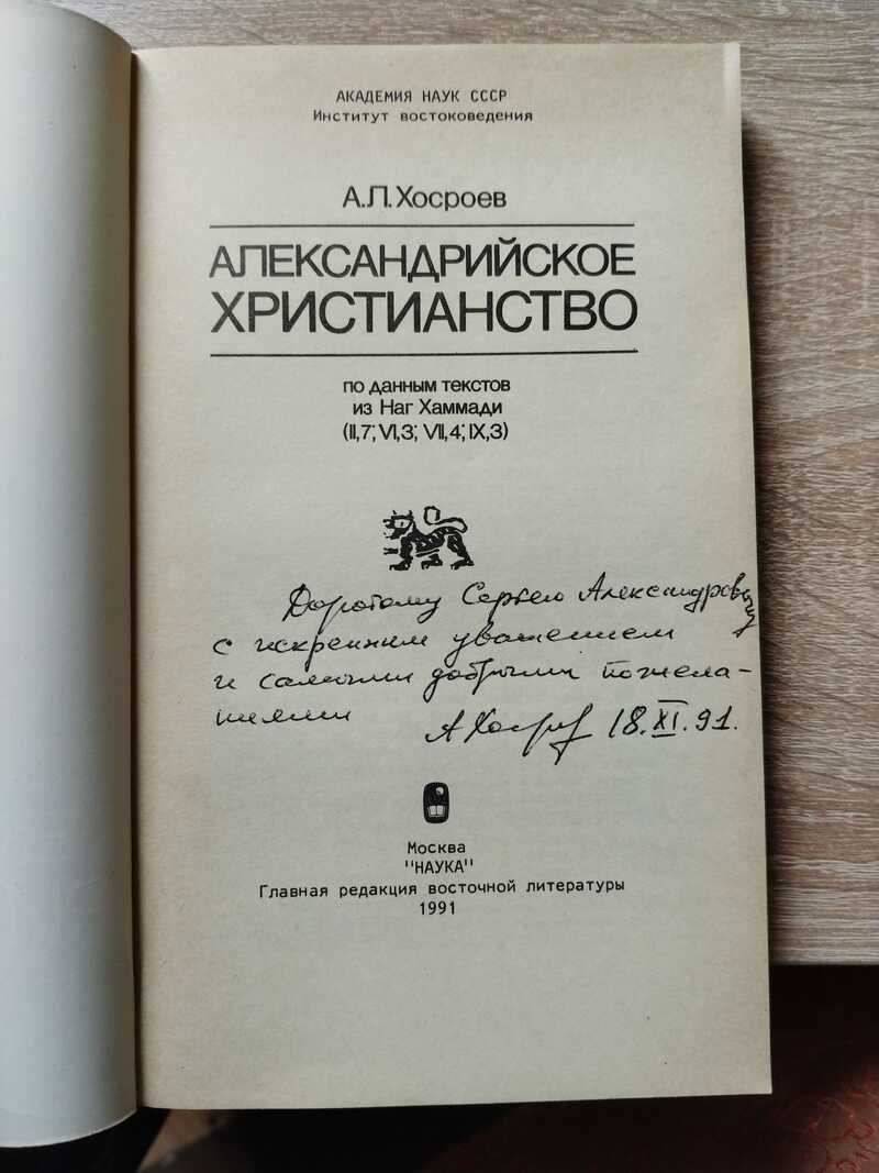 Автограф автора на книге Александрийское христианство по данным текстов из Наг Хаммади (II, 7, VI, 3, VII, 4, IX, 3)