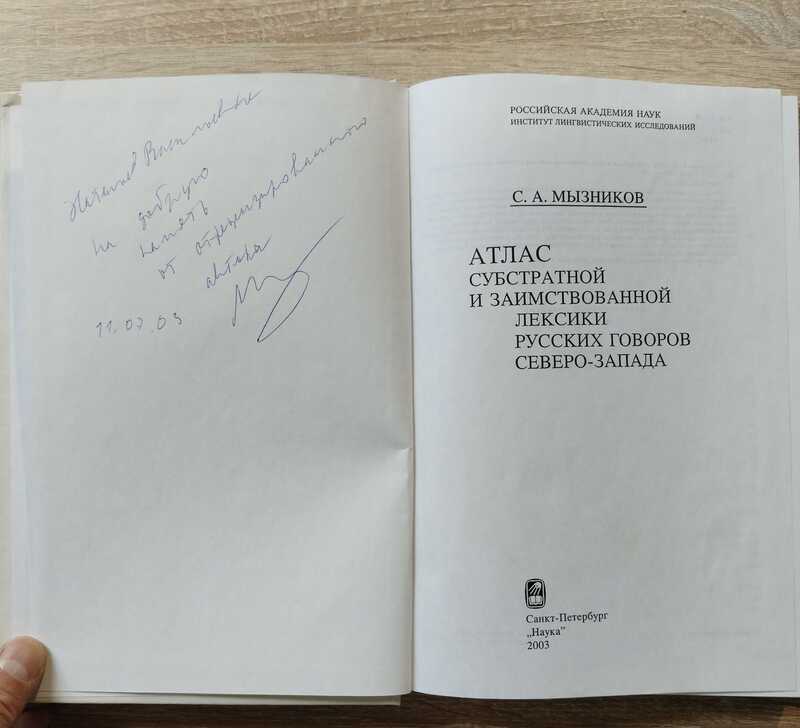 Автограф автора на книге Атлас субстратной и заимствованной лексики русских говоров Северо-Запада