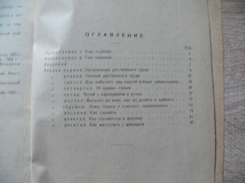 Лекции: Организация умственного труда - . Гигиена умственного труда - . Как работать над книгой (общие предпосылки) - . Десять правил чтения. - Читай с карандашом в руках - . Выписки из книги, как их делать и хранить - . План, тезисы и конспект прочитанного. - Как слушать - . Как готовиться к докладу. - Как выступать с докладом.
