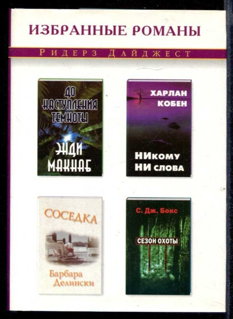 "Никому ни слова" Х.Кобена Двенадцать лет подряд Дэвид Бек и его жена Элизабет в годовщину их первого поцелуя приезжали в одно и то же место - на берег озера, где они впервые поцеловали друг друга. В их тринадцатый приезд Элизабет загадочно пропала в ночной тьме. Вскоре было обнаружено ее тело, предполагаемый убийца получил тюремный срок. Но прошли годы, и доктор Бек начал получать по электронной почте письма, из которых следовало, что дело об убийстве его жены сдано в архив преждевременно. "Соседка" Б.Делински Когда забеременела красивая молодая вдова, живущая в тихом благополучном городке по соседству с тремя семейными парами, подозрение пало на всех троих соседей-мужчин. До того их семейная жизнь складывалась более или менее ровно. Обстановка в городке накалялась и накалялась, пока наконец одно трагическое происшествие не расставило все по своим местам. "До наступления темноты" Э.Макнаб Нелегальному оперативнику британской разведки Нику Стоуну не слишком по душе его последнее задание, однако он поставлен в безвыходное положение и вынужден лететь в Панаму. Там он против своей воли оказывается в центре нечистоплотного военно-политического заговора. От того, какой образ действия изберет Ник Стоун, зависят жизни нескольких тысяч ни в чем не повинных людей. "Сезон охоты" С.Дж.Бокса Поступив на работу егерем в Управление лесного хозяйства штата Вайоминг, Джо Пикетт дал клятву всеми силами защищать животных, находящихся на грани исчезновения. Поиск и задержание алчных убийц никогда не входили в перечень его должностных обязанностей, но жизнь егеря на девственных склонах Скалистых гор полна неожиданностей - порой не самых приятных.