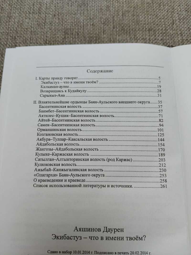В книгу вошли статьи автора по краеведению Павлодарского региона. Глава «Карты правду говорят», благодаря архивным материалам и дореволюционным картам раскрывает истинные значения некоторых топонимов и загадки прошлого. Раздел «Величественные ордынцы Баян-Аульского округа», освещает состав и характеристику членов администрации округа(волостные управители ,бии, старшины) в период с 1830 по 1870 год. Также можно почерпнуть для себя интересные генеалогические сведения о родах : Басентиин, Айдабол, Каржас, Козган, Кулюк, Орманшы, Канжыгалы и Акбура-Тулпар. Тираж 200 экз.