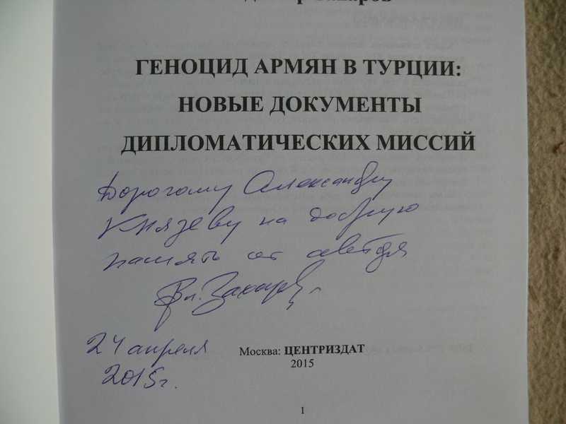 Развернутый автограф автора известному петербургскому поэту и литературоведу Александру Князеву. Книга посвящена истории геноцида армянского населения в Османской империи в конце XIX вв. Основное исследование посвящено событиям 1915 года и уничтожения по приказу младотурок армян. В книге рассказывается о том, кто такие младотурки в этническом отношении, приводится большое количество малоизвестных иностранных свидетельств о зверствах турецких властей в уничтожении почти двух миллионов лиц армянской национальности. Освящается политика турецкого правительство по этому вопросу в XIX веке. Автор публикует неизвестные русским и армянским авторам документы болгарской дипломатической миссии из Стамбула в Софию, сообщавшей о Российской империей в 1915 г. Книга рассчитана и на всех интересующихся историей армяно-турецких отношений и истории геноцида армян в Османской империи.