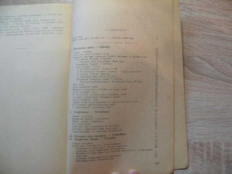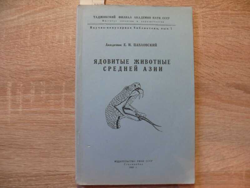 Книга академика, генерал-лейтенанта мед. Сл., заслуженного деятеля науки, лауреаа Сталинской премии Е.Н. Павловского посвящена ядовитым животным Средней Азии. Содержание: I. Ядовитые змеи - Ophidia. II. Скорпионы - Scorpiones. III. Фаланги или сольпуги - Galeodidae. IV. Ядовитые пауки - Araneina. V. Клещи - Acarina. VI. Многоножки - Myriapoda. VII. Ядовитые рыбы - Pisces. VIII. Ядовитые насекомые - Insecta. IX. Некоторые методические указания по собиранию и изучению ядовитых животных. Ил. 45. Тираж 1500 экз.