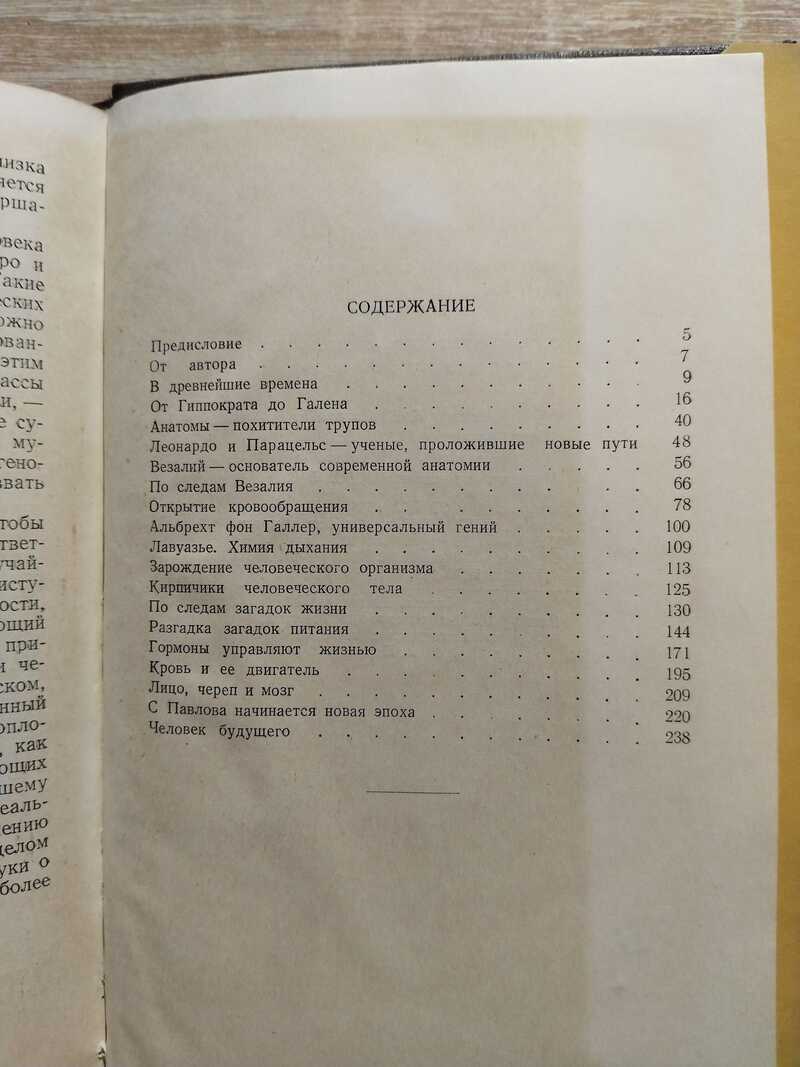 Содержание: В древнейшие времена, - От Гиппократа до Галена, - Анатомы - похитители трупов, - Леонардо и Парацельс - ученые, проложившие новые пути, - Везалий - основатель современной анатомии, - По следам Везалия, - Открытие кровообращения, - Альбрехт фон Галлер, универсальный гений, - Лавуазье. Химия дыхания, - Зарождение человеческого организма, Кирпичики человеческого тела, - По следам загадок жизни, - Разгадка загадок питания, - Гормоны управляют жизнью, - Кровь и ее двигатель, - Лицо, череп и мозг, - С Павлова начинается новая эпоха, - Человек будущего. Тираж книги 7 тыс.экз.