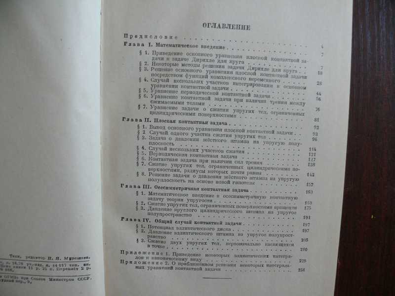 Предисловие. Математическое введение. Плоская контактная задача. Осесимметричная контактная задача. Общий случай контактной задачи. Приведение некоторых эллиптических интегралов к каноническому виду. О приближенном решении некоторых интегральных уравнений контактной задачи.