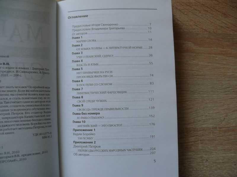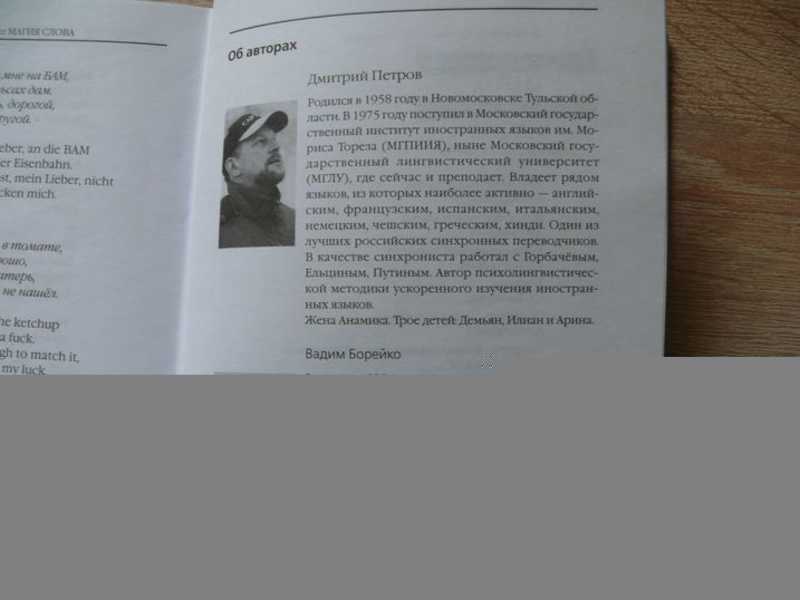Сколько языков может знать человек? По крайней мере, столько, сколько людей вы знаете. Если вы наблюдательны и гибки в своем восприятии, вы сумеете понять язык каждого, кто вам повстречался, и стать понятным ему, не отступаясь от своего языка. Так считает один из авторов этой книги, филолог, переводчик, создатель уникальной психолингвистической методики ускоренного обучения иностранным языкам Дмитрий Петров. Его соавтор Вадим Борейко - журналист, замредактора Казахстанской газеты Время - записал их многочисленные беседы о языке, о его влиянии на жизнь каждого человека. Борейко на личном опыте убедился, как работает методика Петрова, и они вместе описали ее в этой книге.