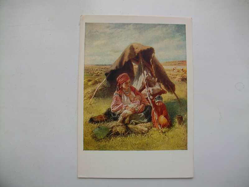 Цветная почтовая карточка с видом на женщину кормящюю младенца и маленькой девочкой рядом в палатке в поле.