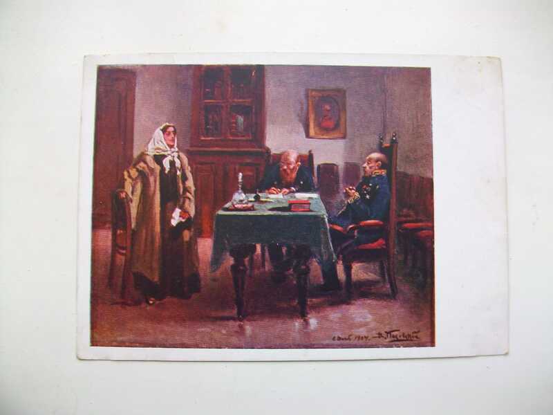 Цветная почтовая карточка с видом на кабинет следователя гдле следователь и писарь ведут допрос женщины.