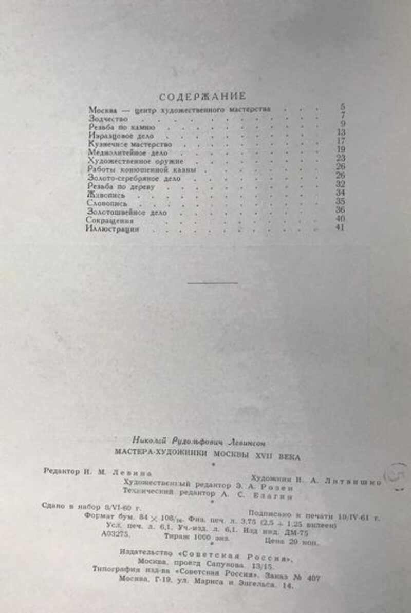 Издали Москва XVII в. представлялась сплошной серой массой невысоких деревянных домов, над которыми кое-где возвышались каменные здания церквей. На окраинах видны были крепостные сооружения монастырей-сторожей, составлявших оборонительные форпосты столицы Русского государства. По мере приближения к Москве все явственнее вырисовывалась планировка города, выделялись кольца оборонительных оград, смыкавшихся вокруг Кремля - местопребывания царя, патриарха и средоточия государственного управления. Кремль господствовал над Москвой. На общем фоне деревянных построек его величественные, монументальные сооружения выделялись белизной стен и блистали позолотой куполов, над всем городом возвышался грандиозный столп колокольни Ивана Великого. Книга рассказывает о мастерах зодчества, резьбы по камню и дереву, кузнечного, изразцового, меднолитейного, золотого и серебряного дела. Превосходные фотографии показывают работы мастеров. Разделы: Зодчество. Резьба по камню. Изразцовое дело. Кузнечное мастерство. Меднолитейное дело. Художественное оружие. Работы конюшенной казны. Золото-серебряное дело. Резьба по дереву. Живопись. Словопись. Золотошвейное дело. Тираж 1000 экз.