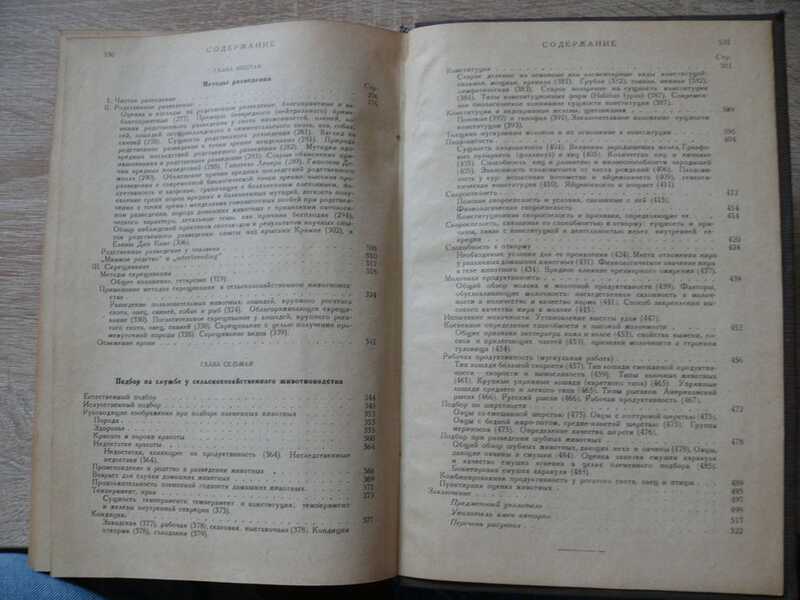Оглавление - Происхождение домашних животных. Порода и общие признаки пород. Влияние среды на организм сельскохозяйственных домашних животных. Наследственность. Прикладное учение о наследственности. Методы разведения. Подбор на службе у сельскохозяйственного животноводства. Объемное издание с большим количеством иллюстраций. После победы лысенковщины книга изымалась из библиотек.