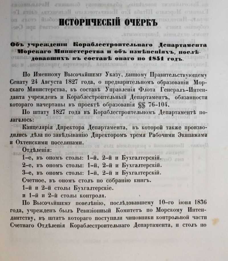 По Высочайшему Указу, данному Правительствующему Сенату 24 августа 1827 года, о предварительном образовании Морского Министерства, в составе Управления флота Генерал-Интенданта, учрежден и Кораблестроительный Департамент, в обязанности которого входило: руководство проектированием, постройкой и ремонтом судов, заведывание хозяйственной частью кораблестроения.