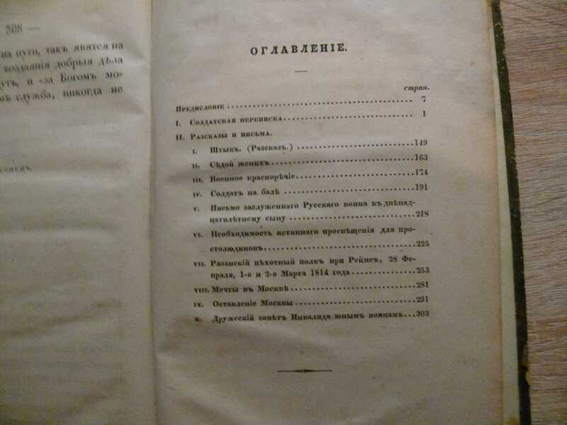 Скобелев Иван Никитич, 1778 -1849 - генерал от инфантерии и военный писатель, на службе с 14 лет солдатом. В финляндскую компанию 1808 - 1809 гг. участвовал в двадцати сражениях и был ранен. Адъютантом при генерале Раевском участвовал в кампании 1811 г. против турок, отличился при взятии Силистрии и Шумлы, был ранен. Адъютантом Кутузова отличился в Бородинском сражении Отечественной войны 1812 г., участвовал в кампаниях 1813, 1814 и 1815 гг. В 1822-1826 г. - генерал-полицмейстер Первой армии, написал несколько доносов на А.С. Пушкина. В марте 1831 г. в сражении у Минска против восставших поляков ядром раздробило левую руку. Во время операции, Скобелев, сидя на барабане, диктовал прощальный приказ по полку. В 1831 г. напечатал первый сборник рассказов Подарок товарищам, или Переписка русских солдат в 1812 году. С 1834 г. издавал рассказы под псевдонимом Русский инвалид. Переписка и рассказы русского инвалида издавались в 1838, 1841 и 1844. Характерными особенностями произведений считается оригинальная форма изложения, простота и правдивость. Писал живым простонародным языком, использовал солдатский юмор и пословицы. Скобелев писал: «не помню ничего лучше русского солдата». Все мировоззрение Скобелева наполнено чувством религиозности и патриотизма доходившим до фанатизма. Содержание: Заставка - литографическая гравюра Шевалье Беседа русского инвалида в кругу его сослуживцев. Титул. Посвящение. Предисловие русского безрукого инвалида к первому изданию (XIV). I. Солдатская переписка (1-149). II. Рассказы и письма. I. Штык. II. Седой жених. III. Военное красноречие. IV. Солдат на бале. V. Письмо заслуженного русского воина к девятнадцатилетнему сыну. VI. Необходимость истинного просвещения для простолюдинов. VII. Рязанский пехотный полк при Реймсе. 28 февраля, 1-е и 2-е марта 1814 г. VII. Мечты в Москве. IX. Оставление Москвы. X Дружеский совет Инвалида юному воину.