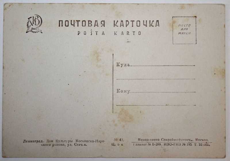 Почтовая карточка. Ленинград. Дом Культуры Московско-Нарвского района, ул. Стачек