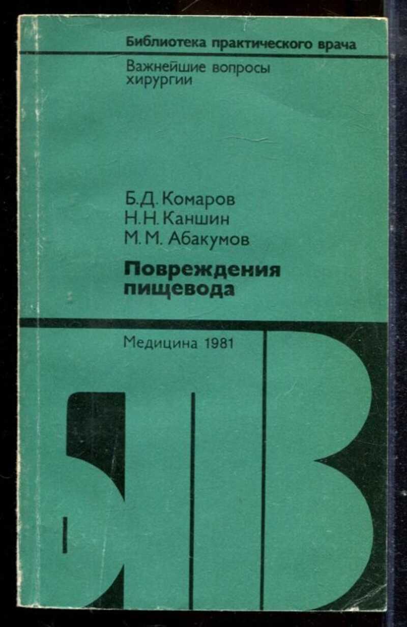 В книге «Повреждение пищевода» (1981) Б. Д. Комаров, Н. Н. Каншин и М. М. Абакумов систематизируют сведения о различных видах повреждений пищевода — механических травмах, химических и термических ожогах, повреждениях при инструментальных вмешательствах и инородных телах. Авторы подробно излагают классификацию патологий, описывают методы диагностики (включая клиническое обследование, рентгенографию и эзофагоскопию), освещают принципы хирургического и консервативного лечения, а также особенности ведения пациентов в послеоперационном периоде. Издание, снабжённое иллюстративным материалом, адресовано хирургам, гастроэнтерологам и специалистам в области торакальной хирургии.