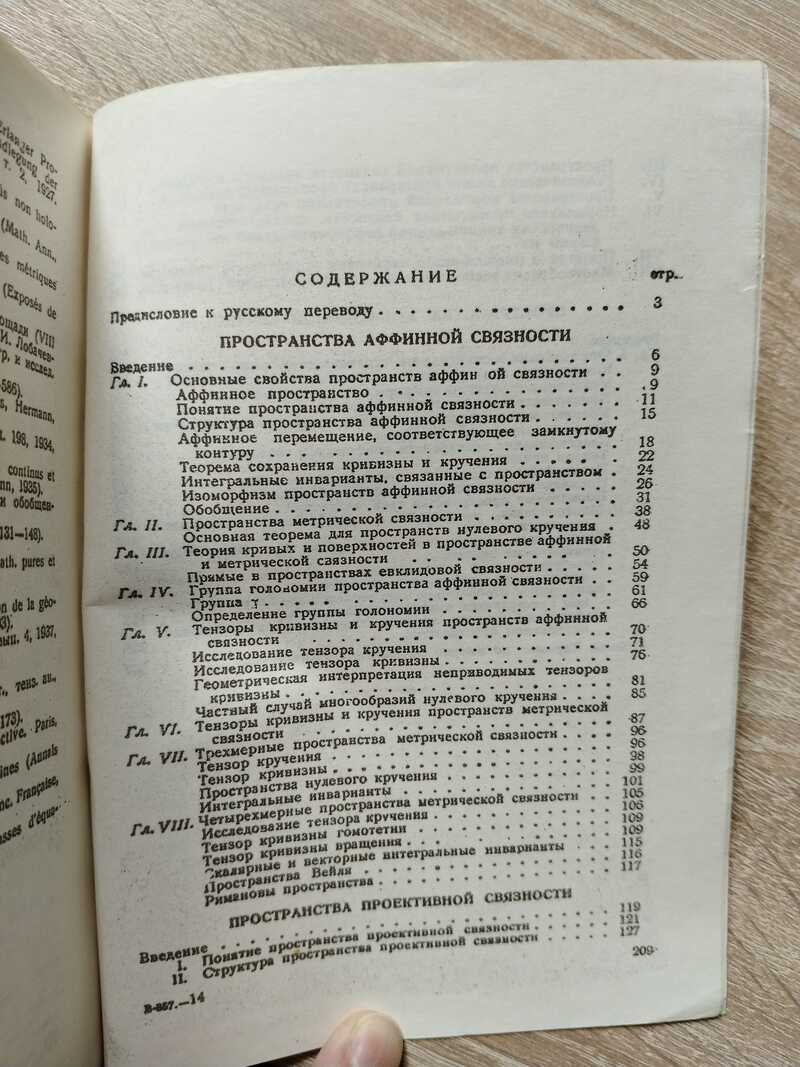 Переиздание книги 1962 года. Эли Жозеф Картан (фр. Elie Joseph Cartan, 9 апреля 1869, Доломье, Изер, Франция - 6 мая 1951, Париж) - французский математик, член Парижской АН (1931). Окончил знаменитую Высшую нормальную школу (1891, Париж), с 1912 профессор Парижского университета. Ученик Гастона Дарбу и Софуса Ли. Основные труды - по теории непрерывных групп, дифференциальных уравнений и дифференциальной геометрии. В 1894 заложил основы алгебраической теории групп Ли. В 1913 построил теорию представлений полупростых групп Ли с дифференциальной геометрией и топологией. В 1899-1902 создал так называемый метод внешних форм, который позволил ему разрешить проблему совместности систем пфаффовых уравнений. В дифференциальной геометрии многомерных пространств им построены обобщенные пространства аффинной, проективной и конформной связности и, кроме того, дан общий метод подвижного репера, который в соединении с методом внешних форм является эффективным средством решения геометрических проблем. Автор ряда важных работ в области математической физики. После того, как А. Эйнштейн создал общую теорию относительности стал заниматься единой теорией поля. Его теория пространств с кручением имеет важное значение для теории торсионных полей. Награжден премией Лобачевского в 1937.